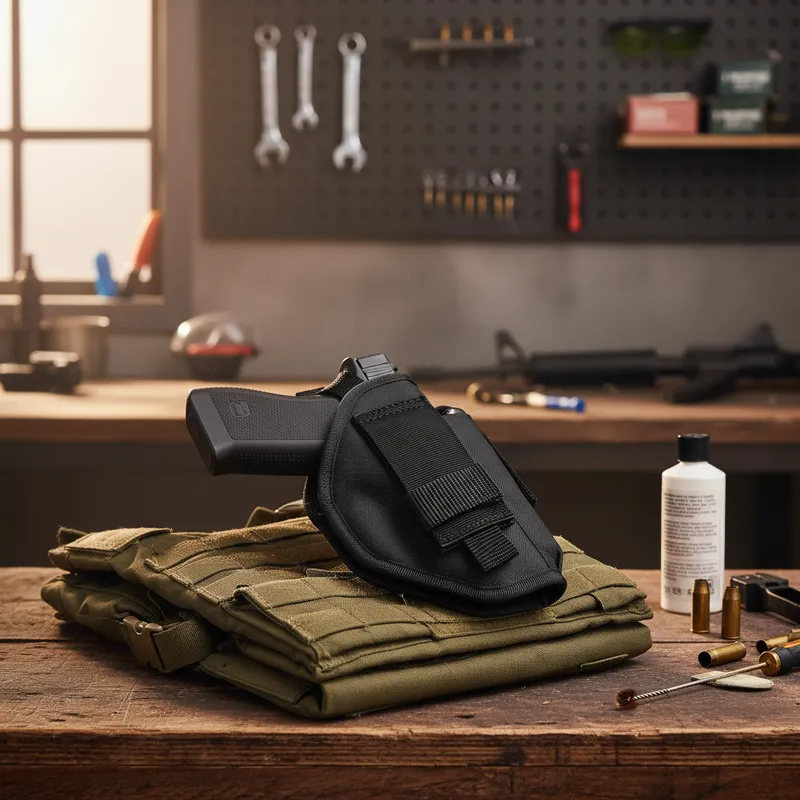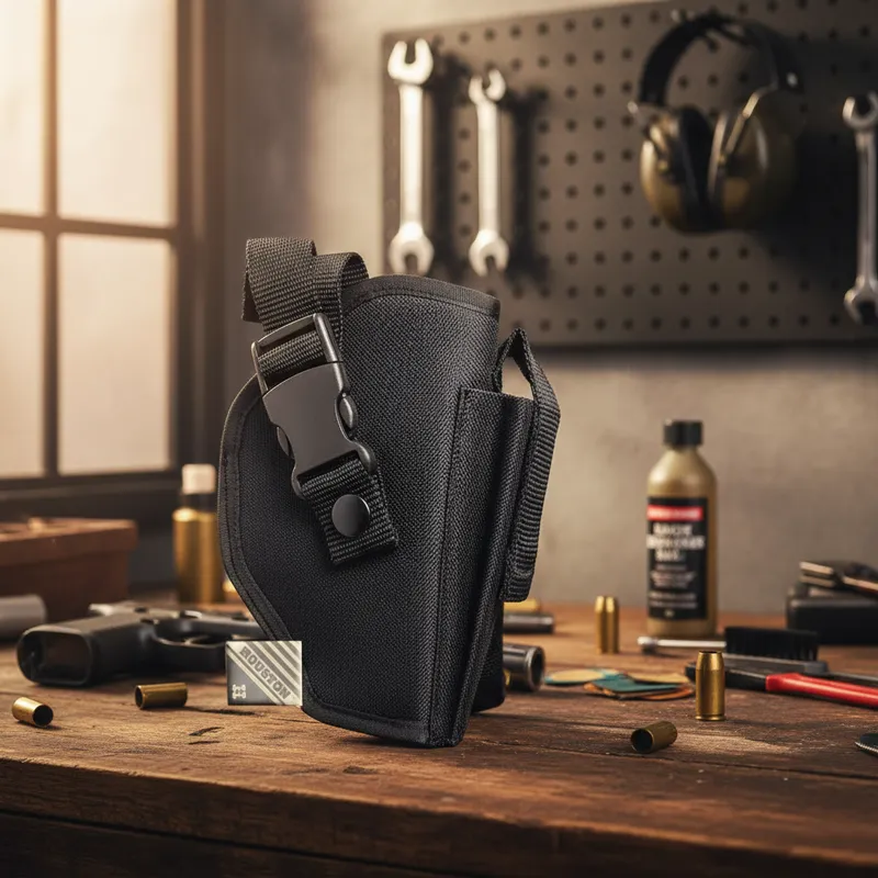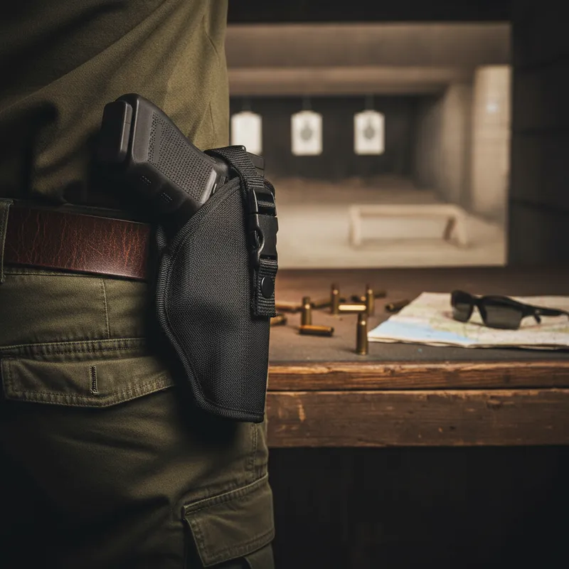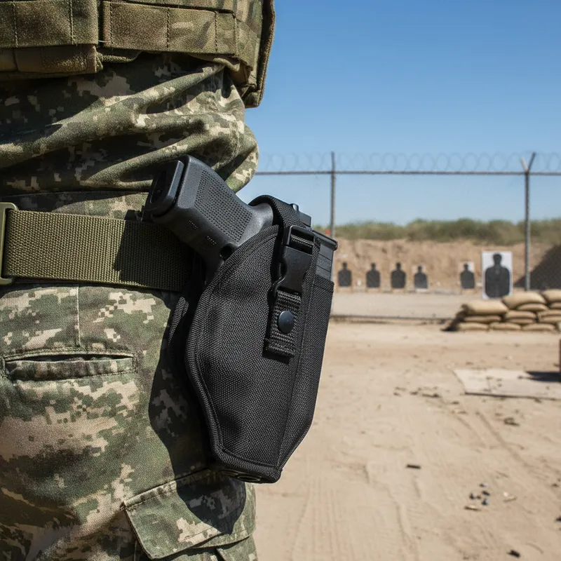 Pistolera tipo panqueque para diestros, ideal para la portación y práctica de tiro deportivo.