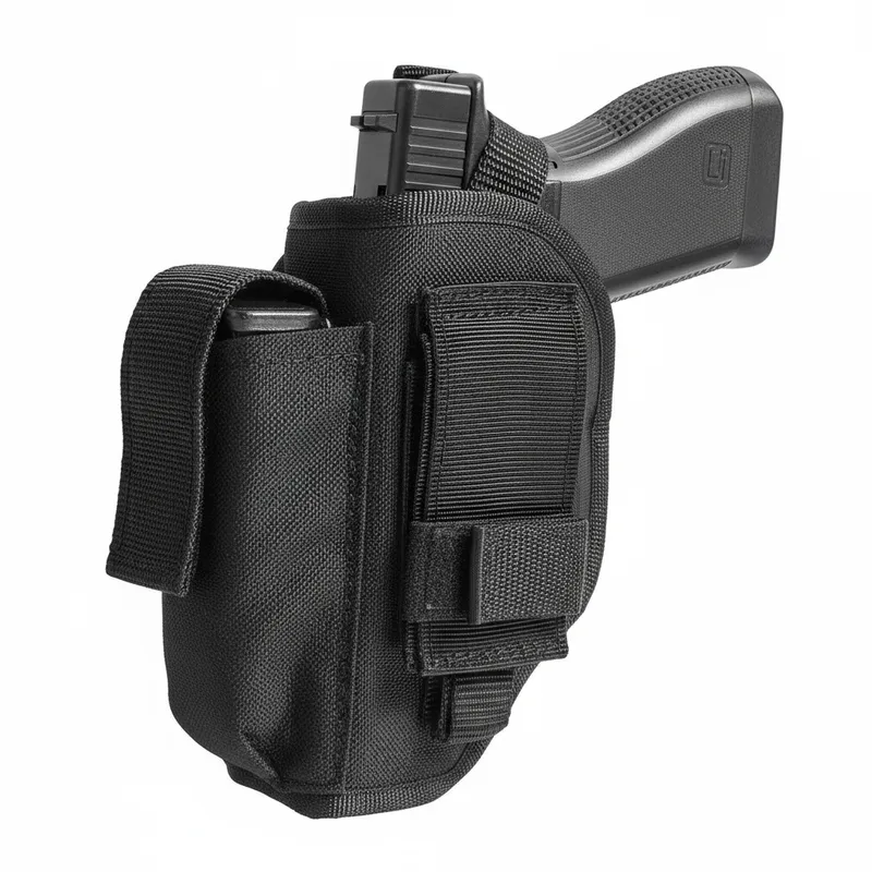 ESPECIFICACIONES TÉCNICAS: o Marca: Houston o Código: Art. 70CR o Pistolera Externa o Compartimento para cargador o Garrafas Co2 o Tela de cordura seleccionada de alta resistencia o Color: Negro o Hebilla plástica reforzada regulable o Belcro para colocar en cinturón o Diseño Premium – Extra mullida