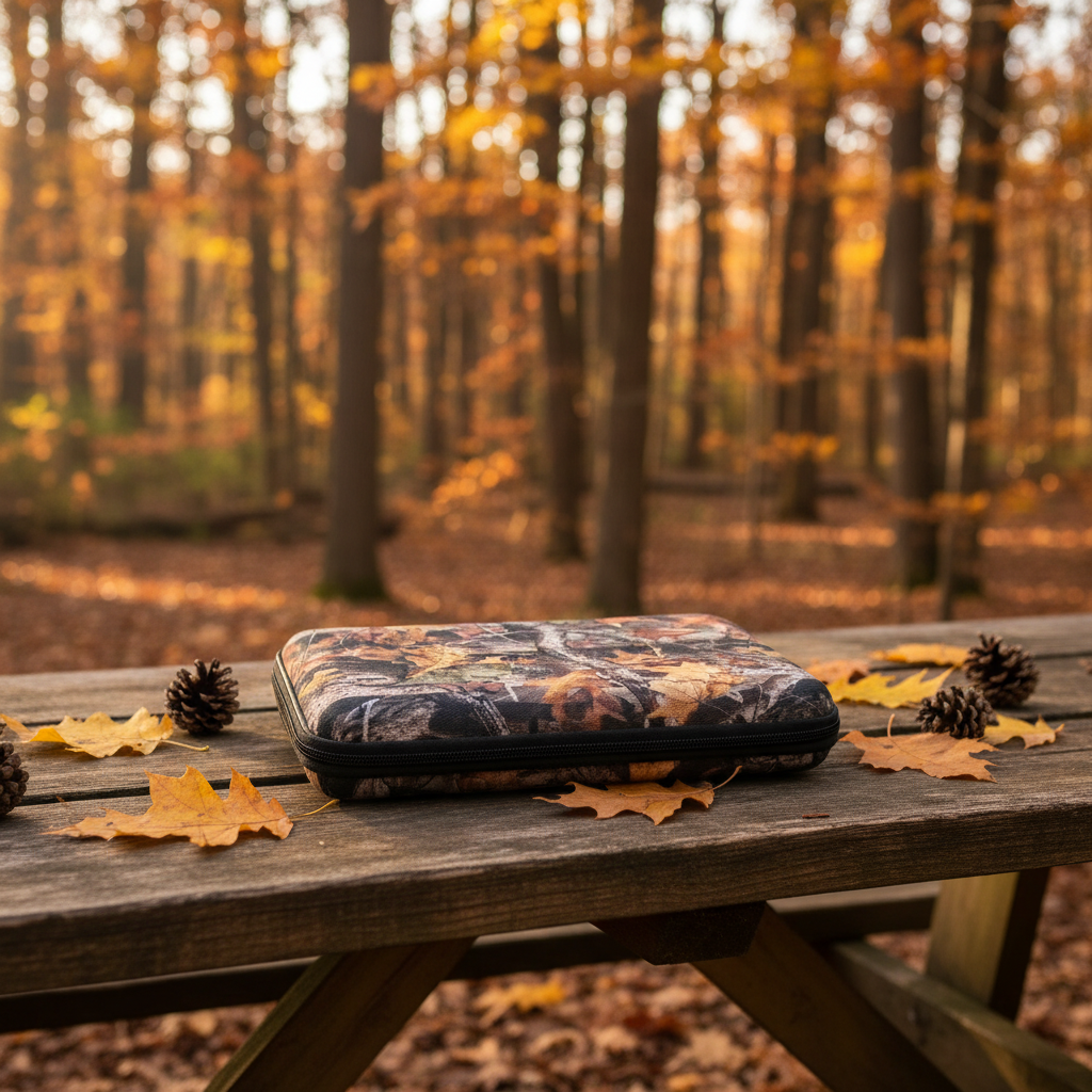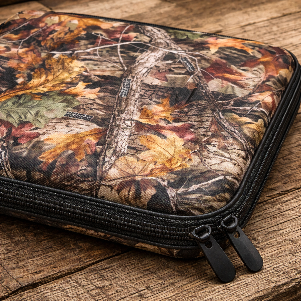 Estuche para transporte de armas cortas Diseño Camo Real Tree – Camuflado Hoja Material Termoformado, revestido en tela impermeable y resistente Apertura mediante cierre de doble camino Interior acolchado en goma espuma de 4 cm para mayor protección Capacidad para 4 armas o 3 y accesorios Industria Argentina Medidas: Largo: 38 cm Ancho: 29 cm Alto: 6 cm